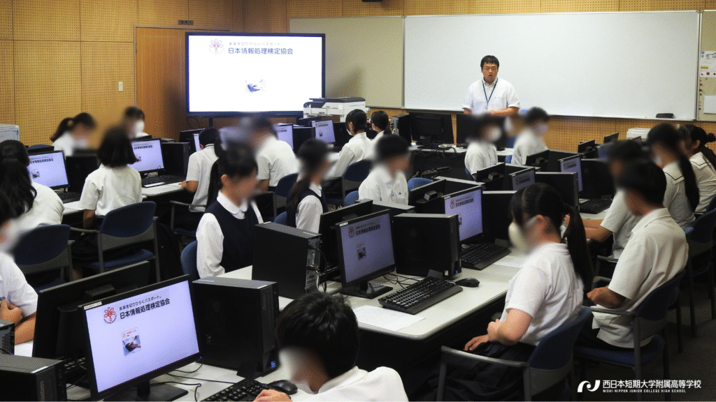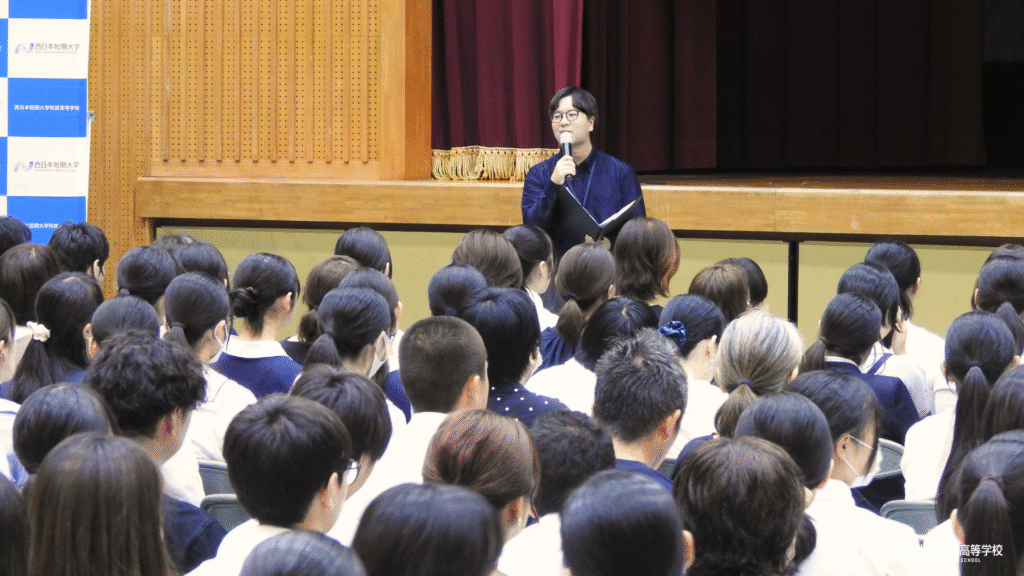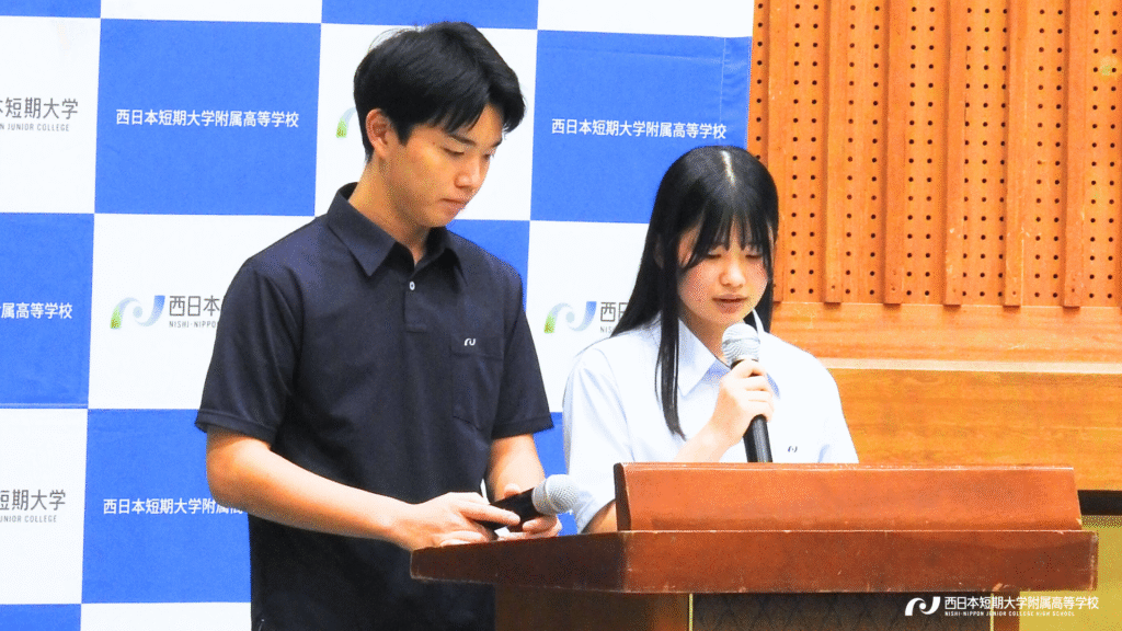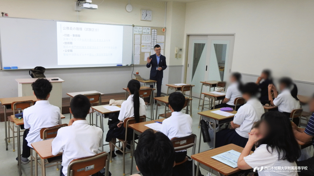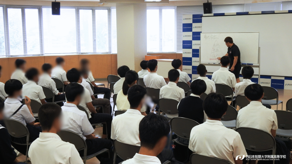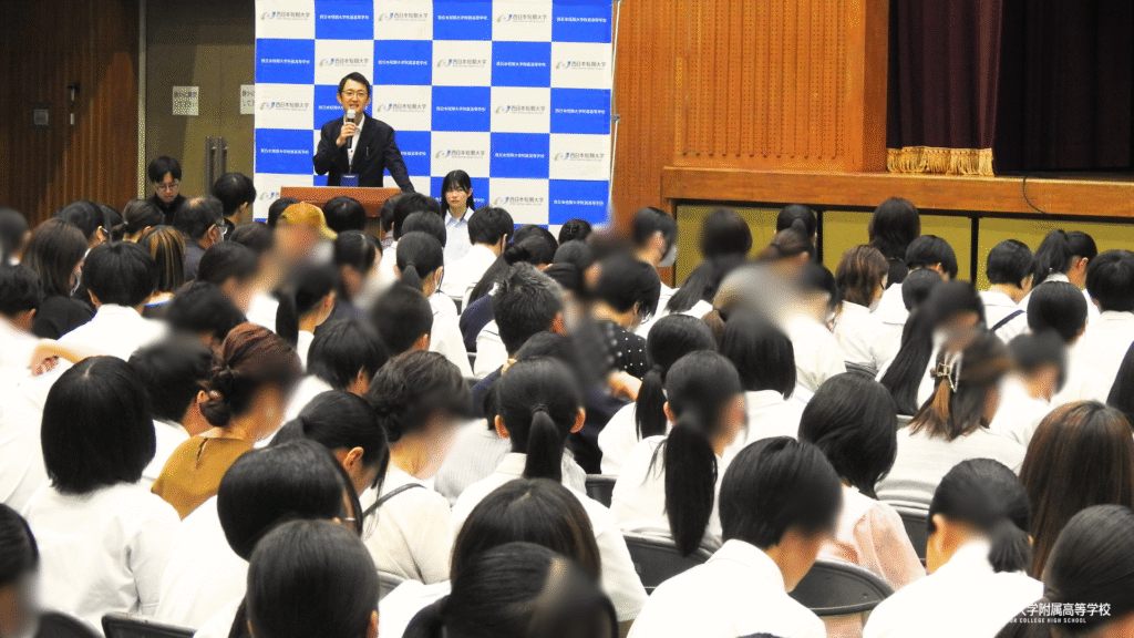 コース紹介では、令和8年4月からの「新コース編成」について、在校生4名の生の声と共に詳しくお届けしました。続く学校行事紹介では青瓈祭(文化祭)のダイジェスト映像を放映。そして制服紹介では「第1回オープンスクール」での「制服投票」を受けて決定した、来年夏導入の「新・夏服ポロシャツ」を実際に生徒が着用して披露。西短らしい”青”を基調とした「スカイブルー(制定品)」と「ネイビー(オプション)」の2パターンは、多くの中学生から好評の声を頂きました。その他、進路指導の取り組みの紹介や入試概要説明など、内容盛りだくさんの説明会となりました。