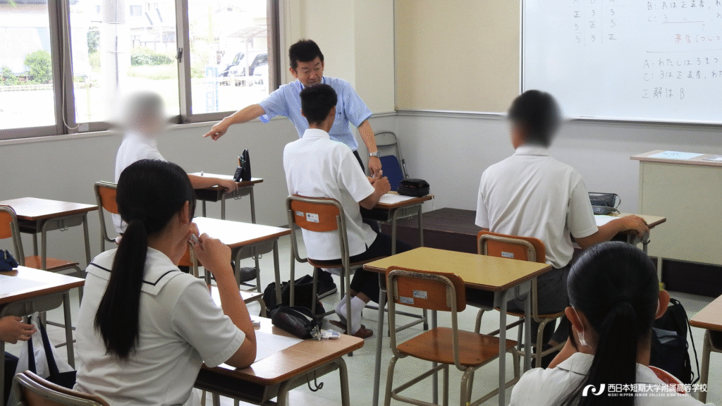 コース体験では、新たな2つのコースが体験授業を展開。中学生の皆さんには申込時に「国語」「数学」「英語「看護」「保育」「ビジネス系検定」「スポーツ理論」「情報処理」「公務員講座」の中から1つ選択していただき、40分バージョンで授業を体験していただきました。本校は1学期に全教室にホワイドボードの設置とワイド画面対応の高輝度プロジェクター、Apple TVの設置が完了しました。今回も多くの授業で活用されていました。