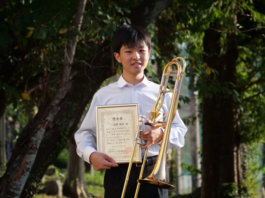 標記大会に本校吹奏楽部2年生の髙瀬夢翔君(朝倉市立甘木中学校出身)が出場し、優秀賞に輝きました。また、審査員より全国大会への推薦をいただき、12月5日(金)に東京都葛飾区で開催される「第35回日本クラシック音楽コンクール」に出場することとなりました。