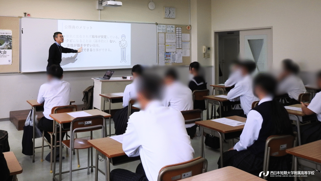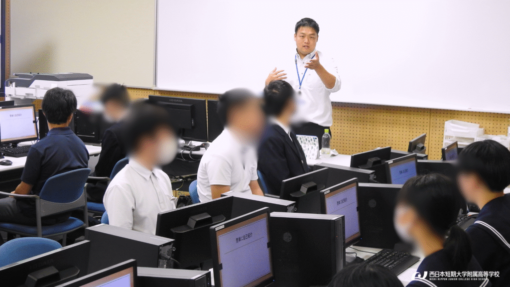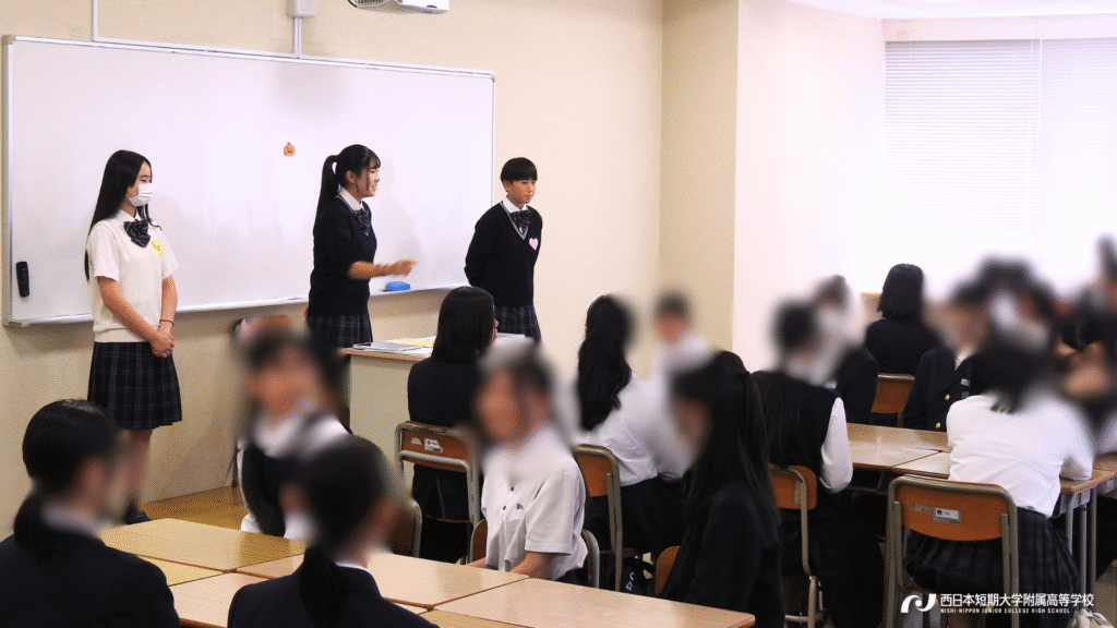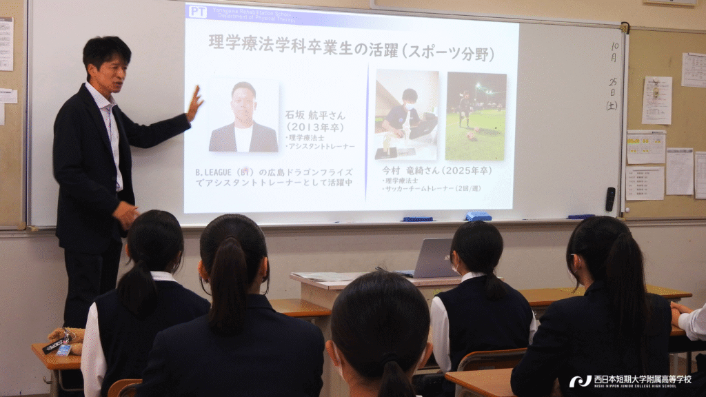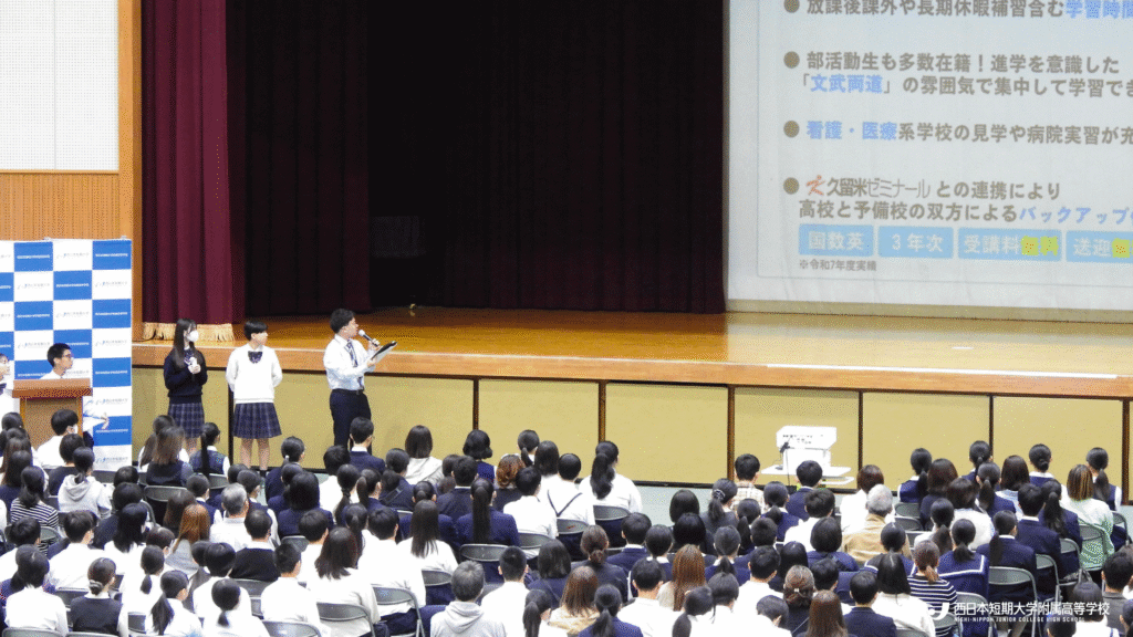 コース紹介では、令和8年4月からの「新コース編成」について、在校生4名の生の声と共に詳しくお届けしました。続く学校行事紹介では、緑茗祭(体育祭)と青瓈祭(文化祭)のダイジェスト映像をご覧いただき、西短の”青春感”を動画を通して感じ取っていただきました。さらに、本校を卒業し現在大学で勉学に励む2名の先輩による「母校振り返りトーク」は中学生や保護者の皆様にとって、西短での高校生活のイメージをより具体化できる時間となったようです。さらに、進路指導の取り組みの紹介や入試概要説明など、内容盛りだくさんの説明会となりました。