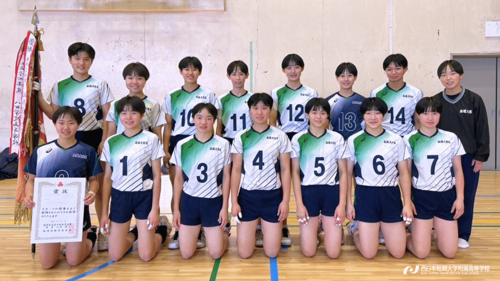 女子バレーボール部が標記大会にて優勝いたしました。強豪ひしめく南部ブロックにおいて2年連続の優勝、そして今年5月のインターハイ南部ブロックに続く優勝です。応援いただきました皆様、誠にありがとうございました。女子バレーボール部は、令和8年1月18日(日)から行われる福岡県大会に南部ブロック優勝校として出場します。今後とも女子バレーボール部の応援をよろしくお願いいたします。