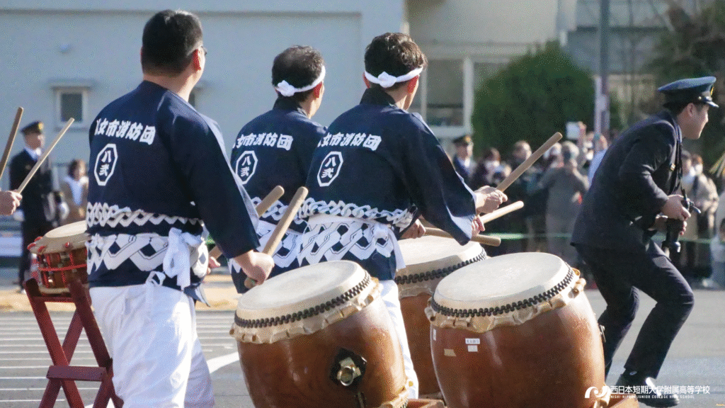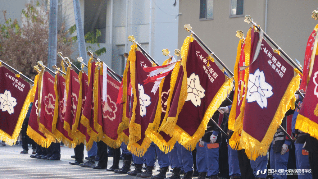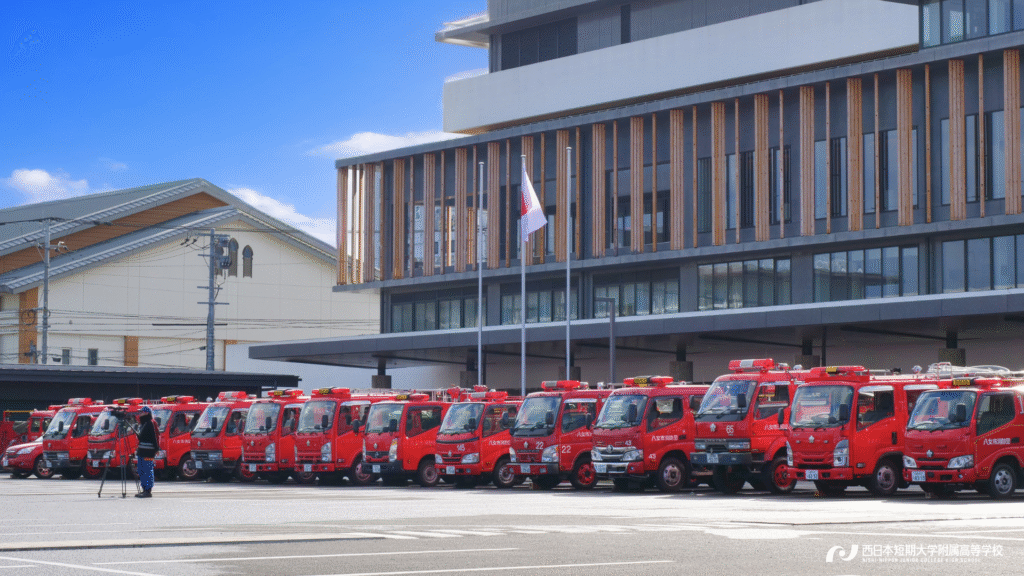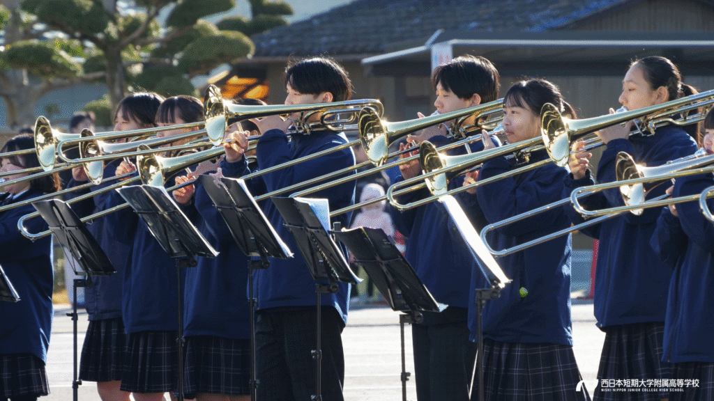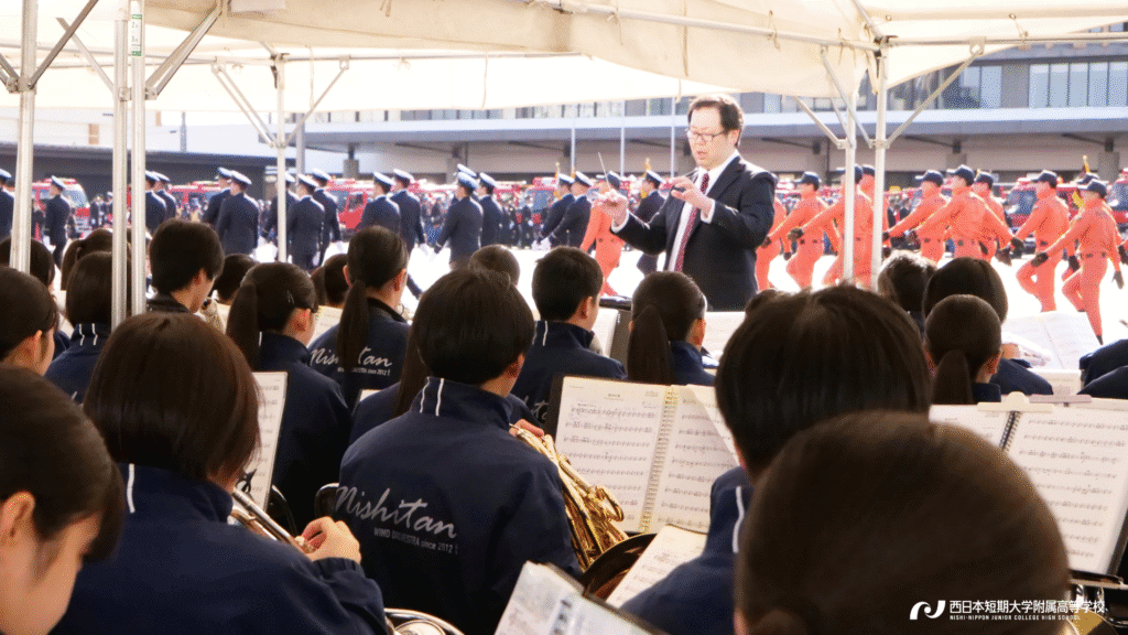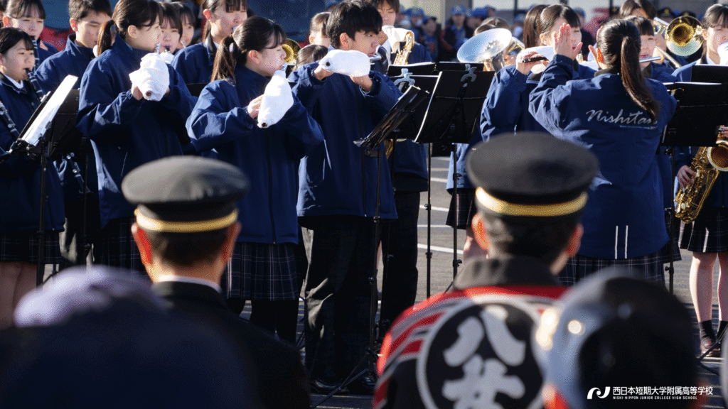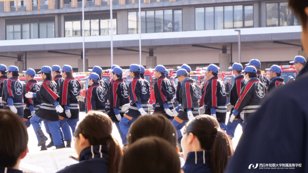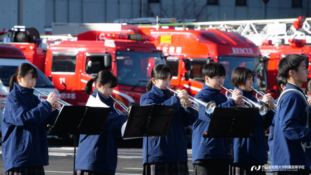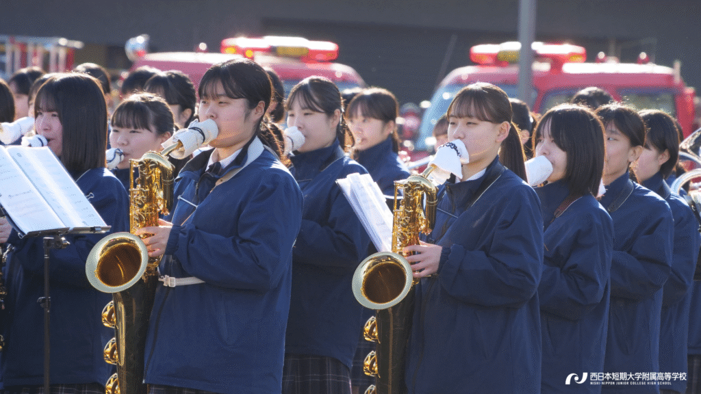 八女市役所駐車場で開催された「八女市消防出初式」にて本校吹奏楽部が式典演奏を担当いたしました。早朝は雨が降りましたが、徐々に天候が回復し日中は4月上旬並みの気温を記録するなど出初式日和となりました。