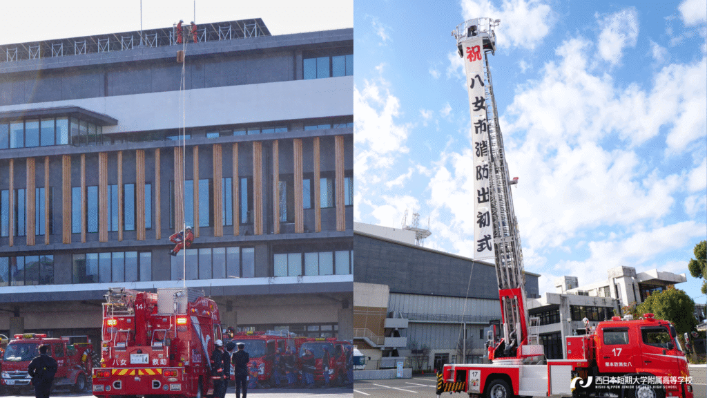 出初式に参加させていただいたのは今回が初めてでしたが、小隊訓練やラッパ隊訓練、馬簾回し、救助総合訓練など八女市の消防の技術と文化を肌で感じることのできる貴重な経験となりました。