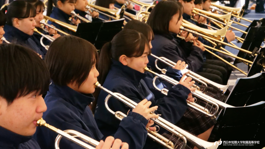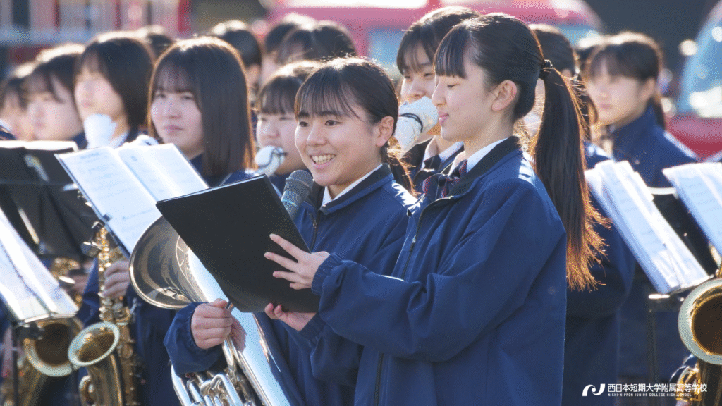 これまで上陽町や立花町で開催されていた出初式でしたが、新庁舎となった八女市役所をバックに今回初めて八女市役所駐車場での開催となりました。演奏には1・2年生約90名が参加しました。