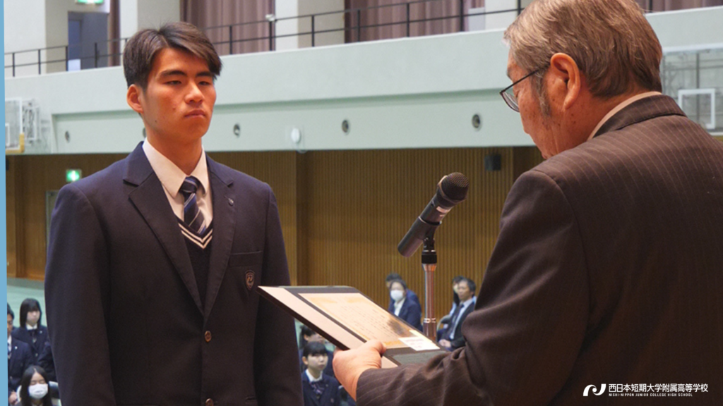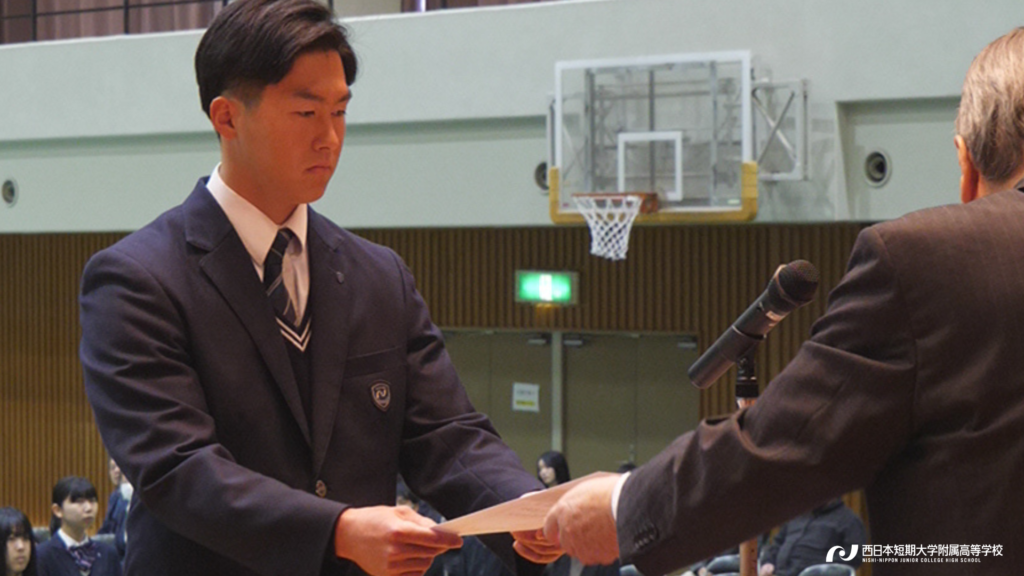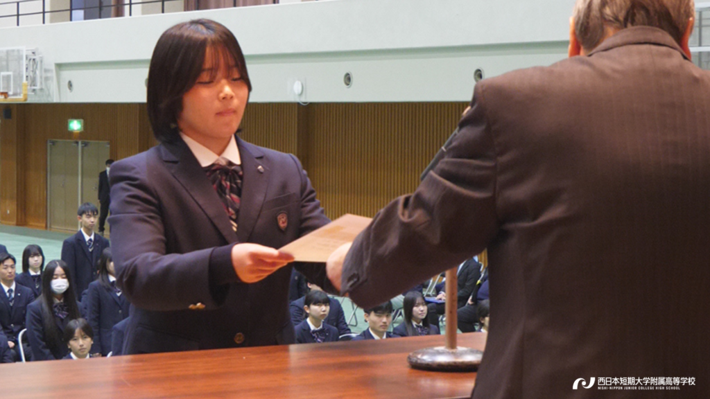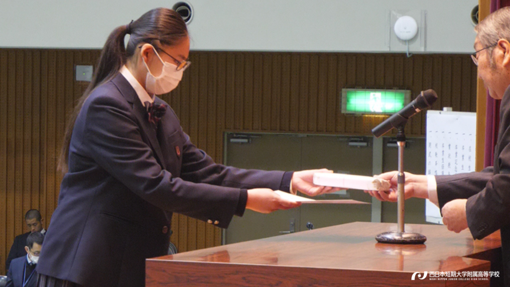卒業証書授与式の前日にあたり、式予行の後に「賞状授与式および同窓会入会式」を行いました。