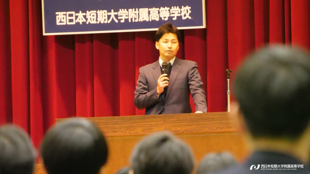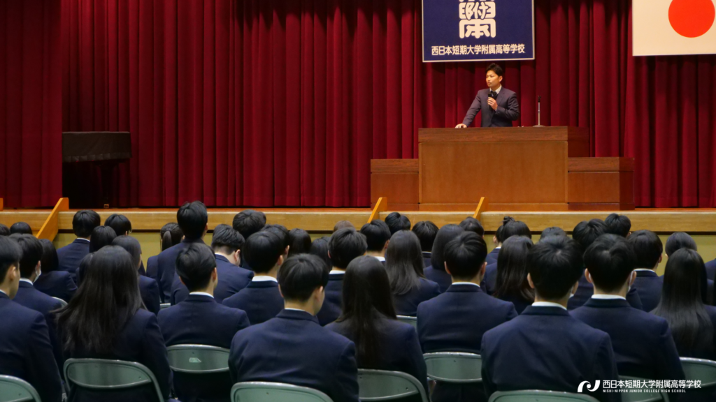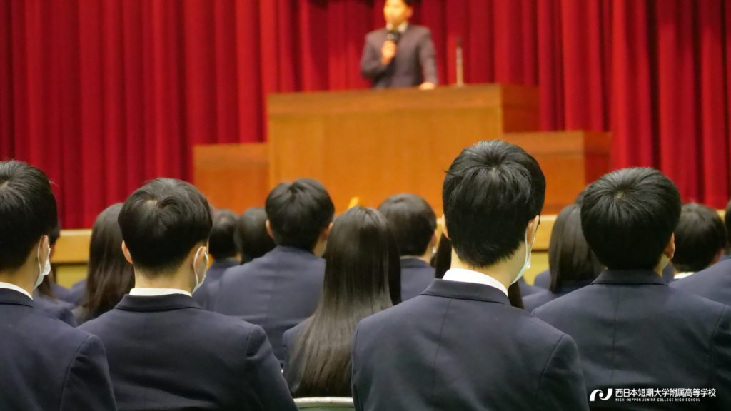 同窓会入会式では、本校同窓生教諭の弓削先生より卒業を迎える3年生へ向けて餞の言葉が送られました。