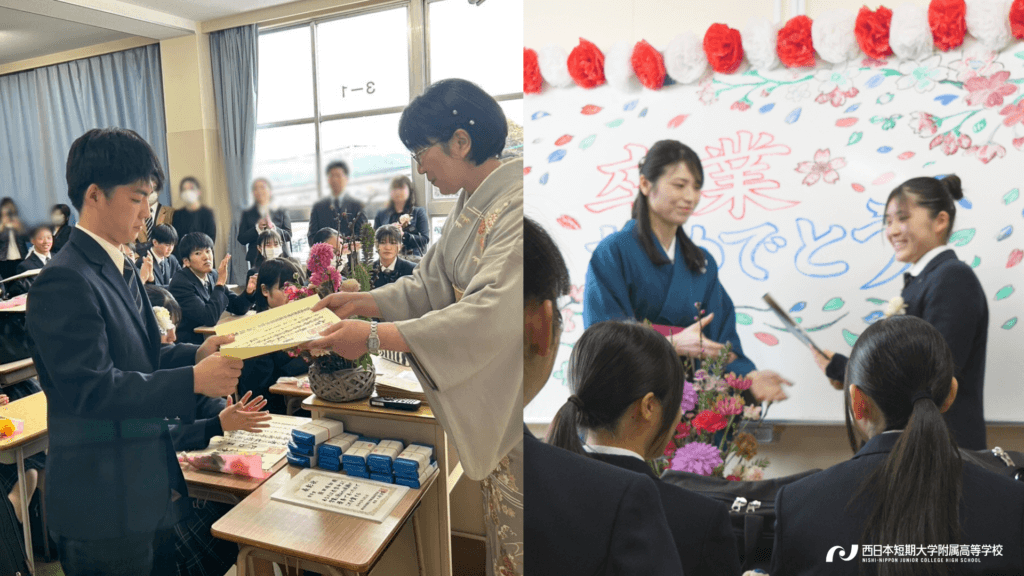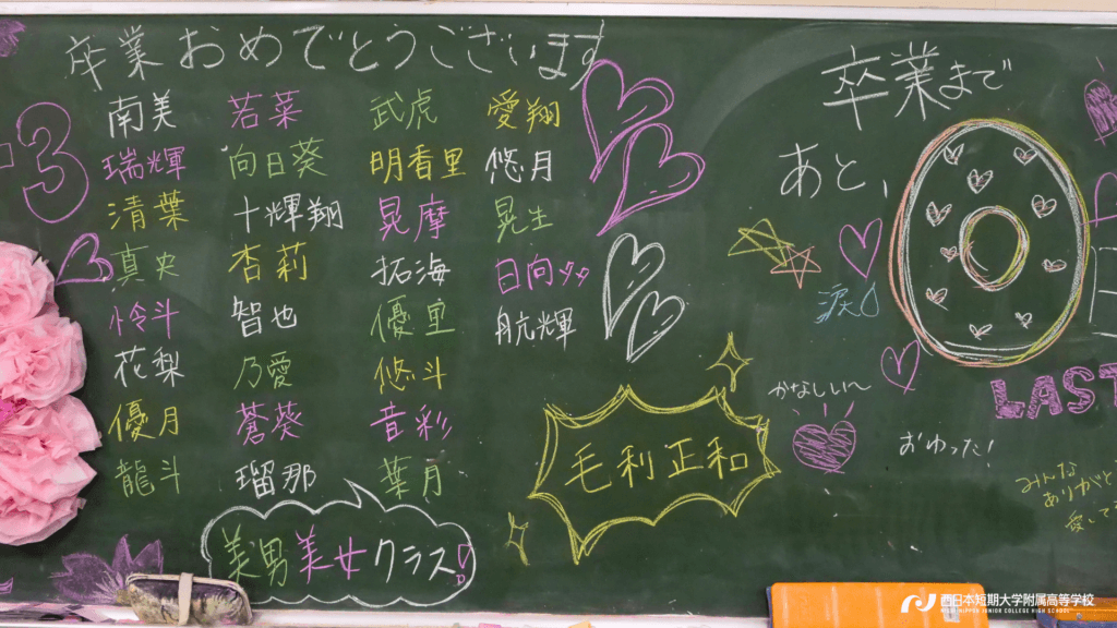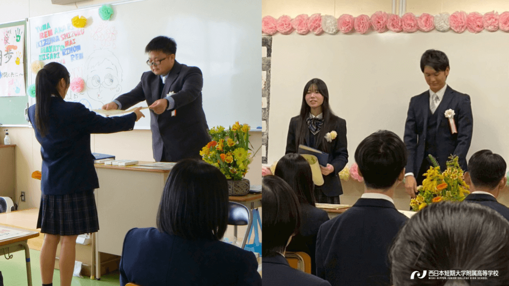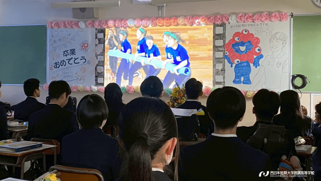 卒業証書や記念品の授与が行われ、スピーチやスライドショーの鑑賞などが各クラスで実施されました。どのクラスも「感謝の言葉」と「笑顔と涙」で溢れていました。