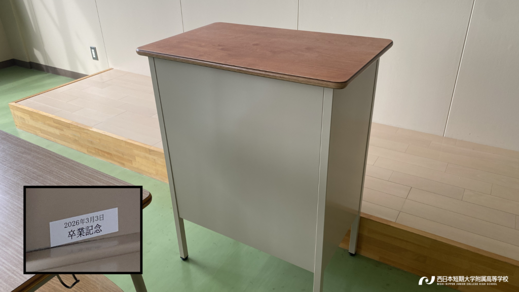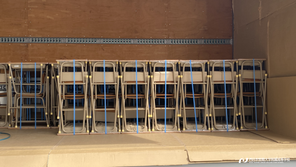 令和7年度卒業記念品の教卓のほか、生徒総数増加に伴い新たに購入した多くの学習机と椅子が校舎に運び込まれました。